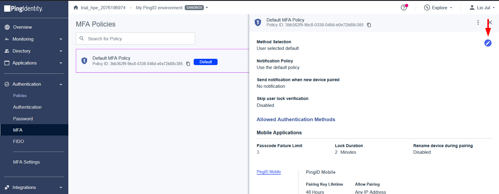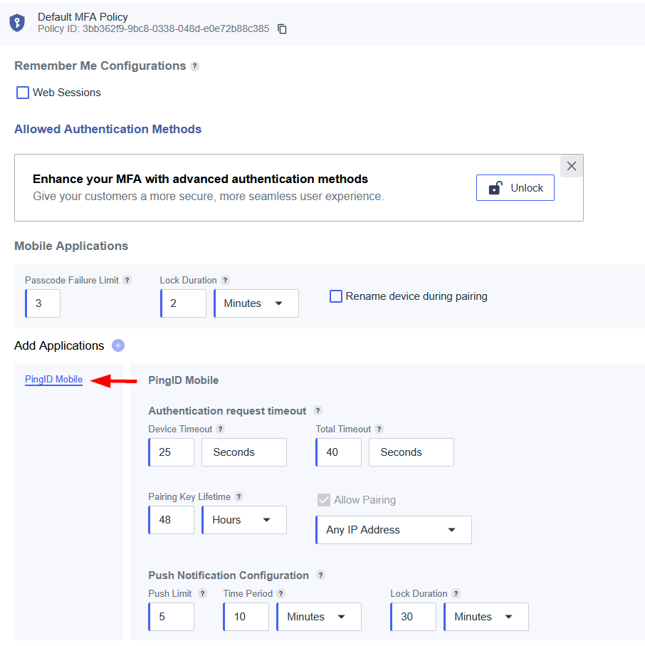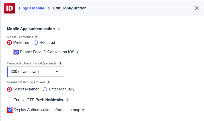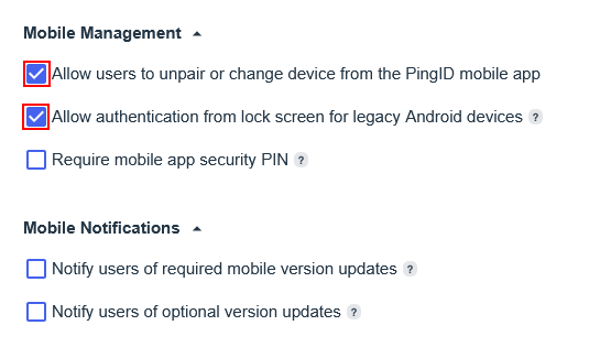 - Allow users to unpair or change device from the PingID mobile app: Checked (allows users to manage their own device pairing)