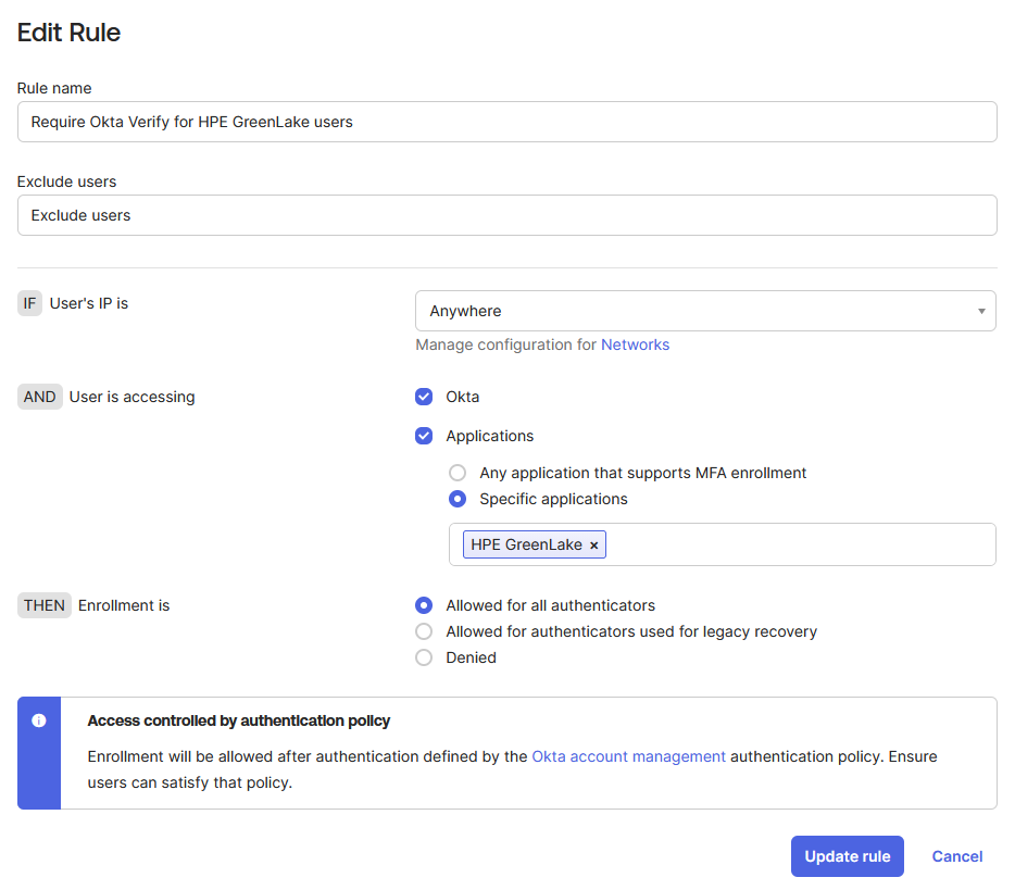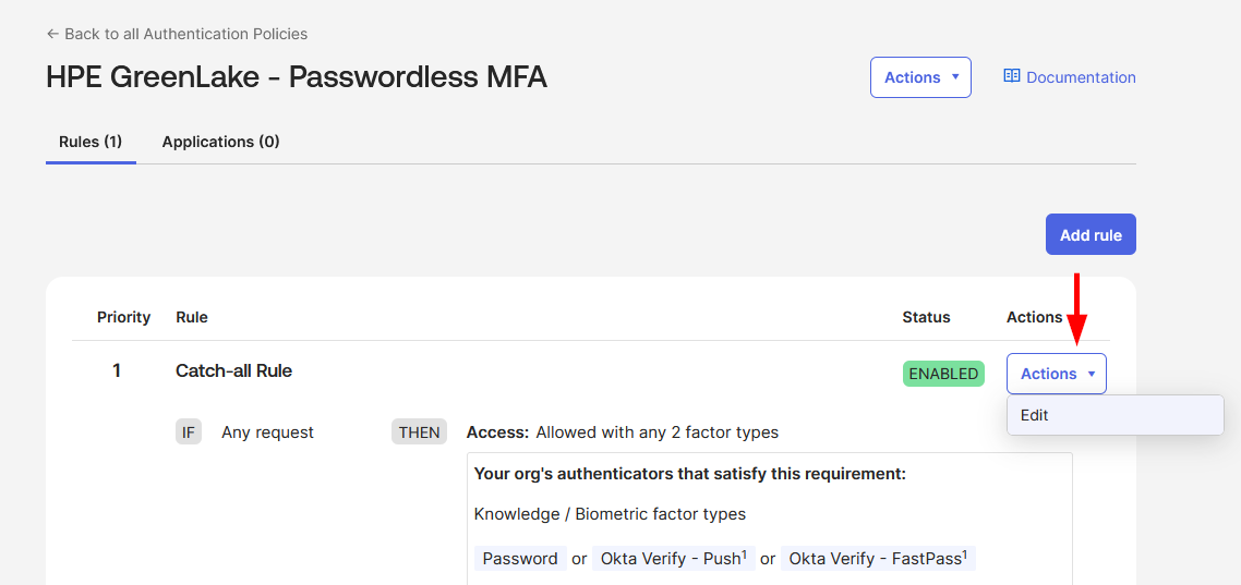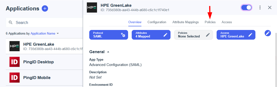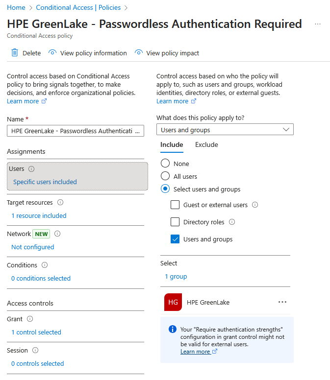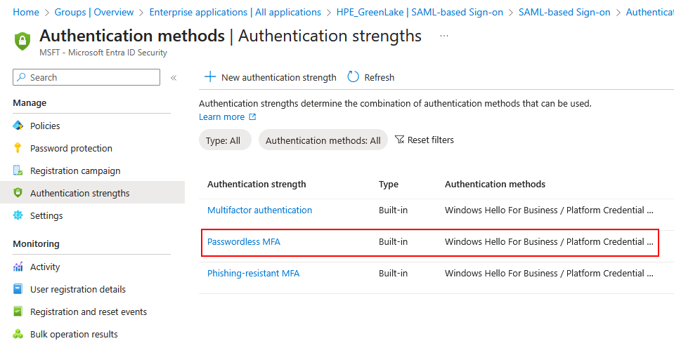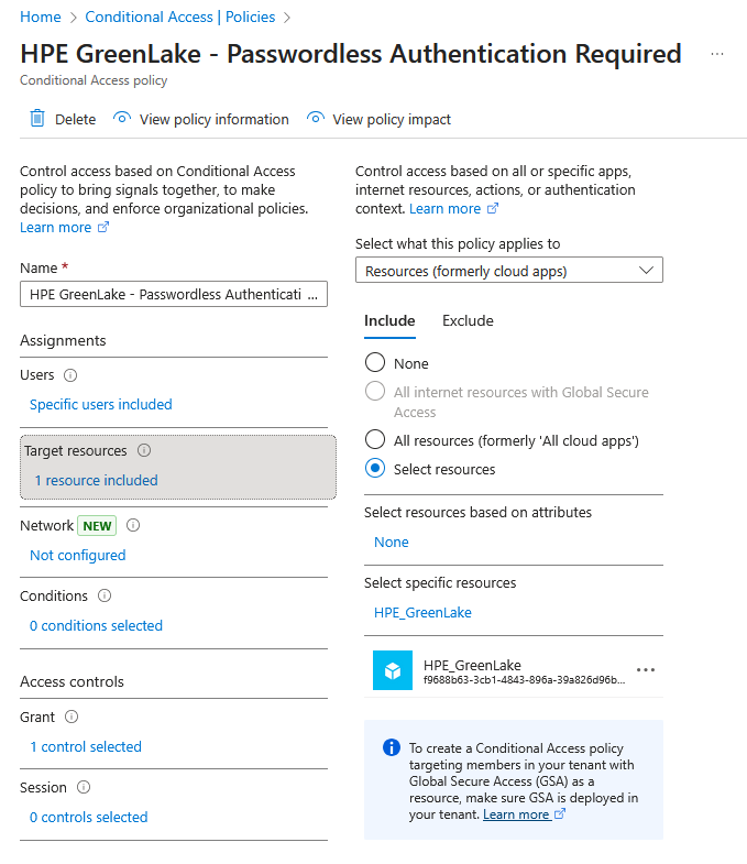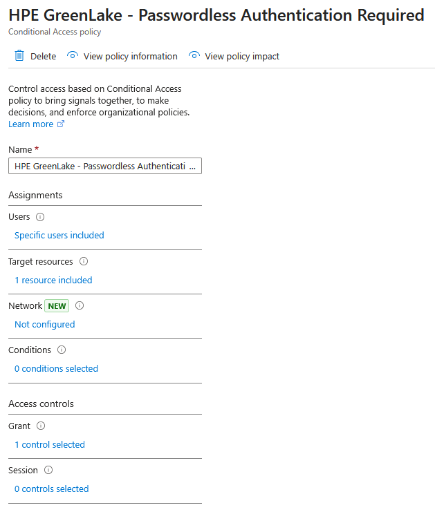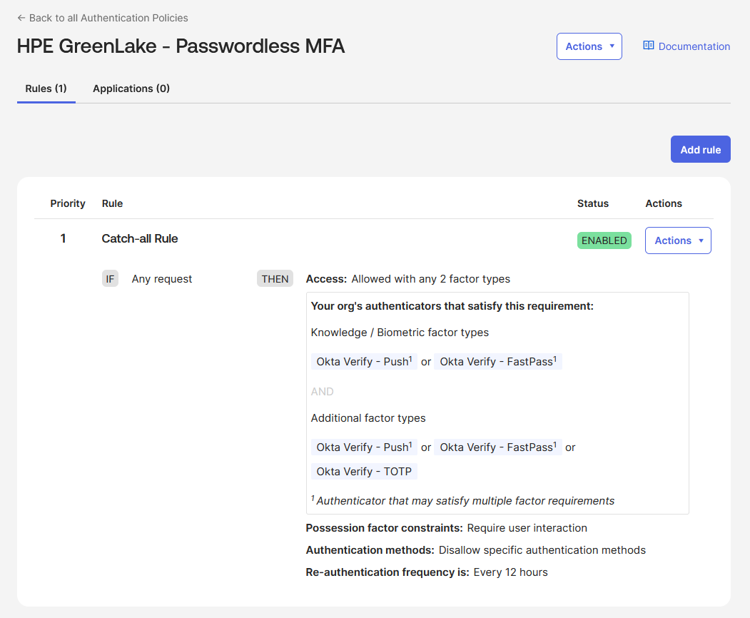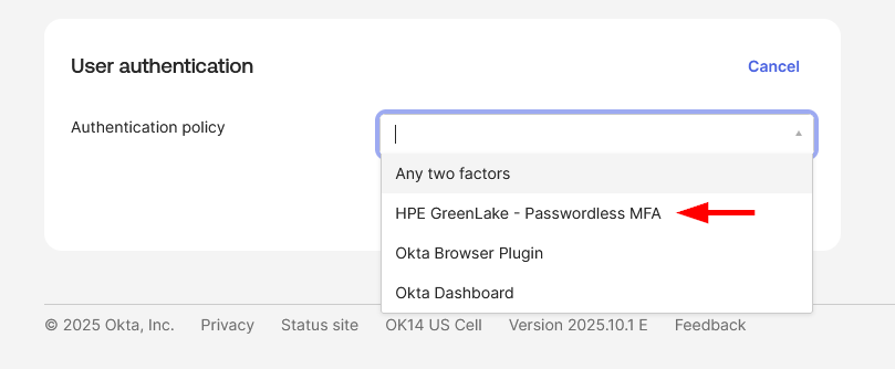 With the passwordless authentication policy created, the final step is to apply this policy to your HPE GreenLake application. This ensures that all authentication attempts to HPE GreenLake will be governed by the passwordless MFA requirements you’ve defined.