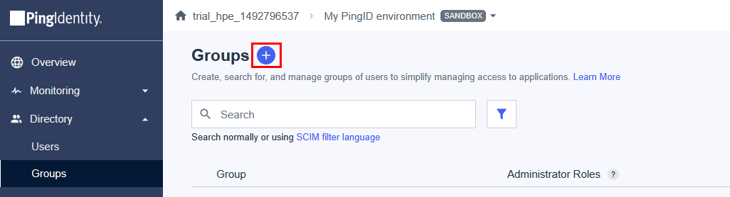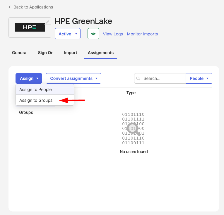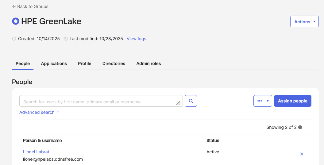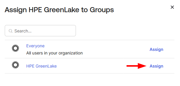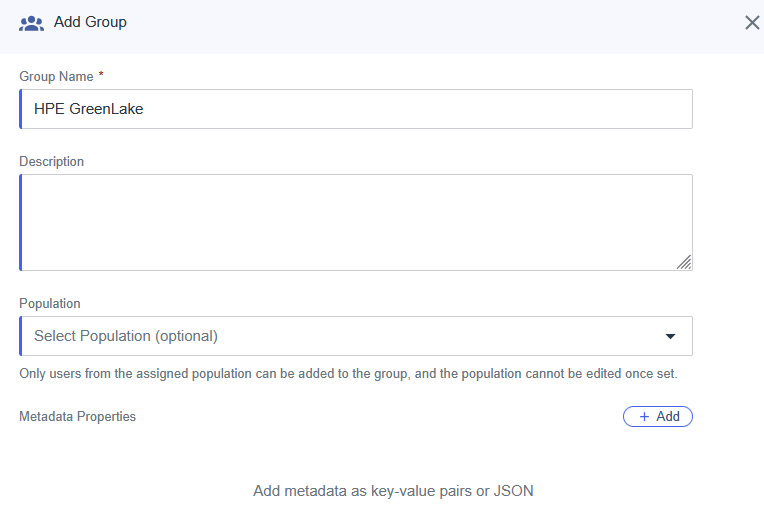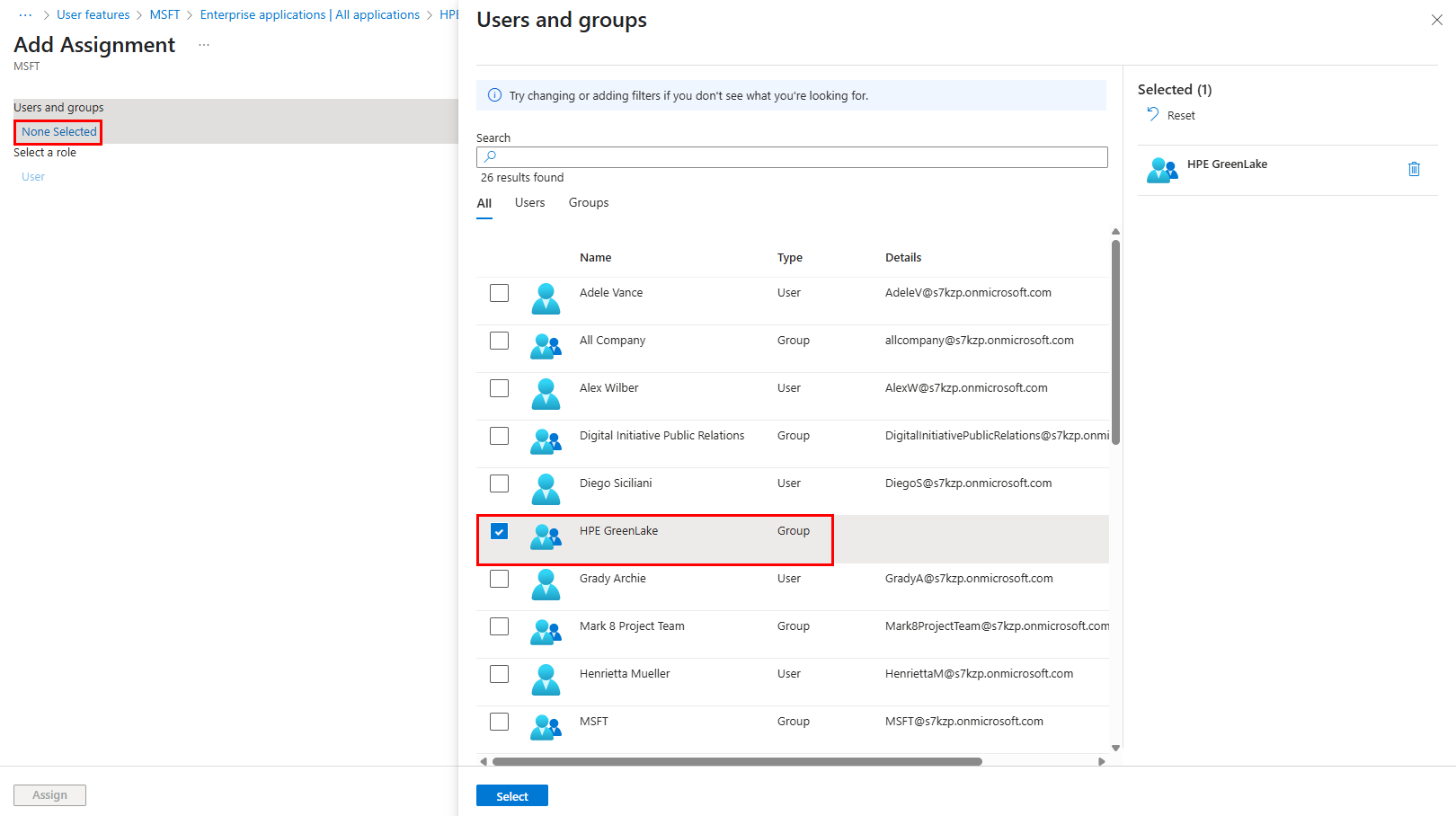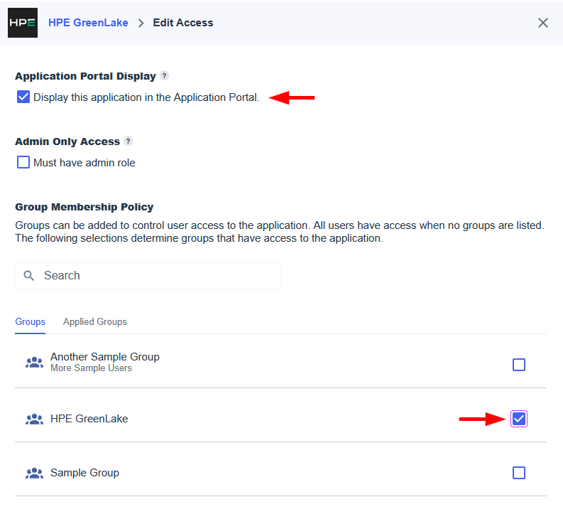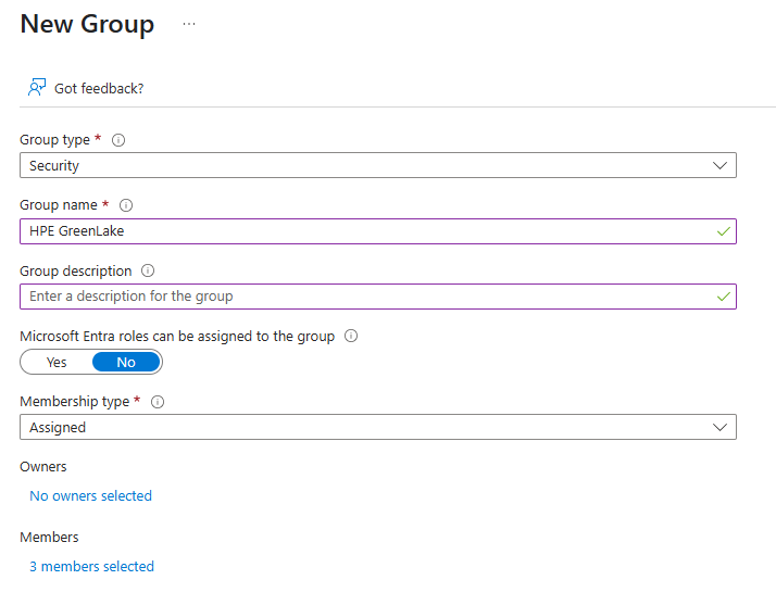 Create a Security group for the HPE GreenLake application. Name it HPE GreenLake and add the members who will be granted access to the application.