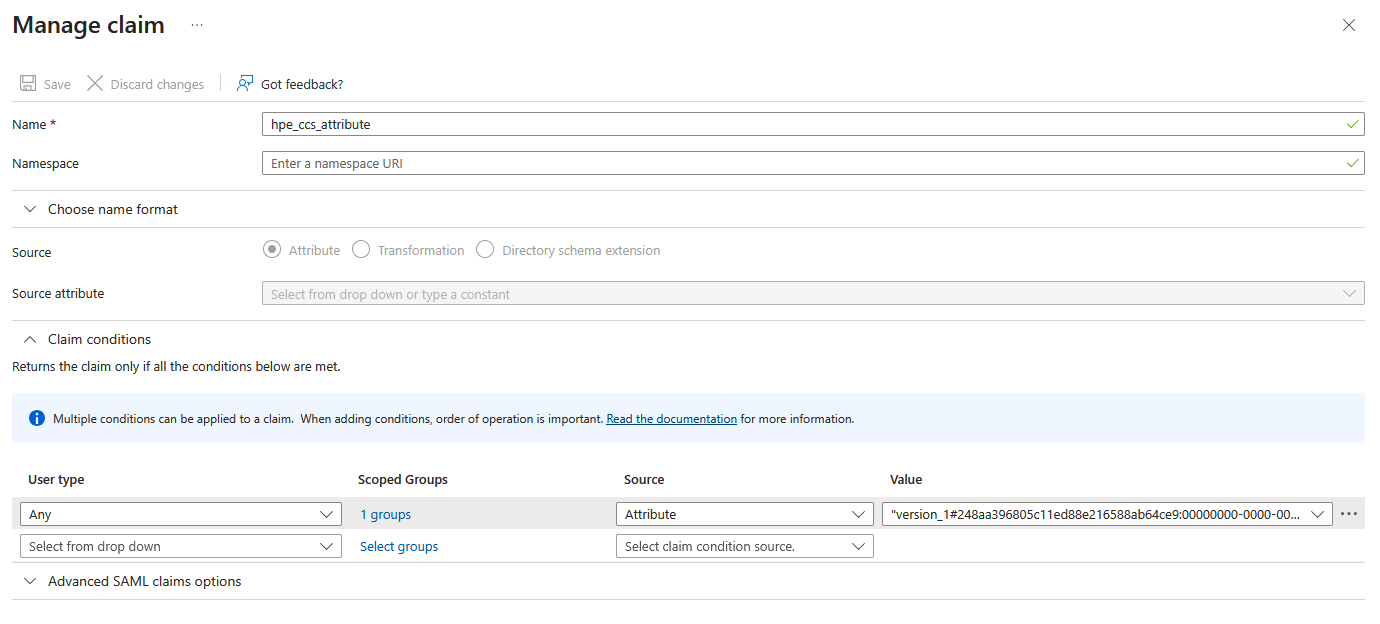- hpe_ccs_attribute format: If using role-based access control through SAML, validate that the
