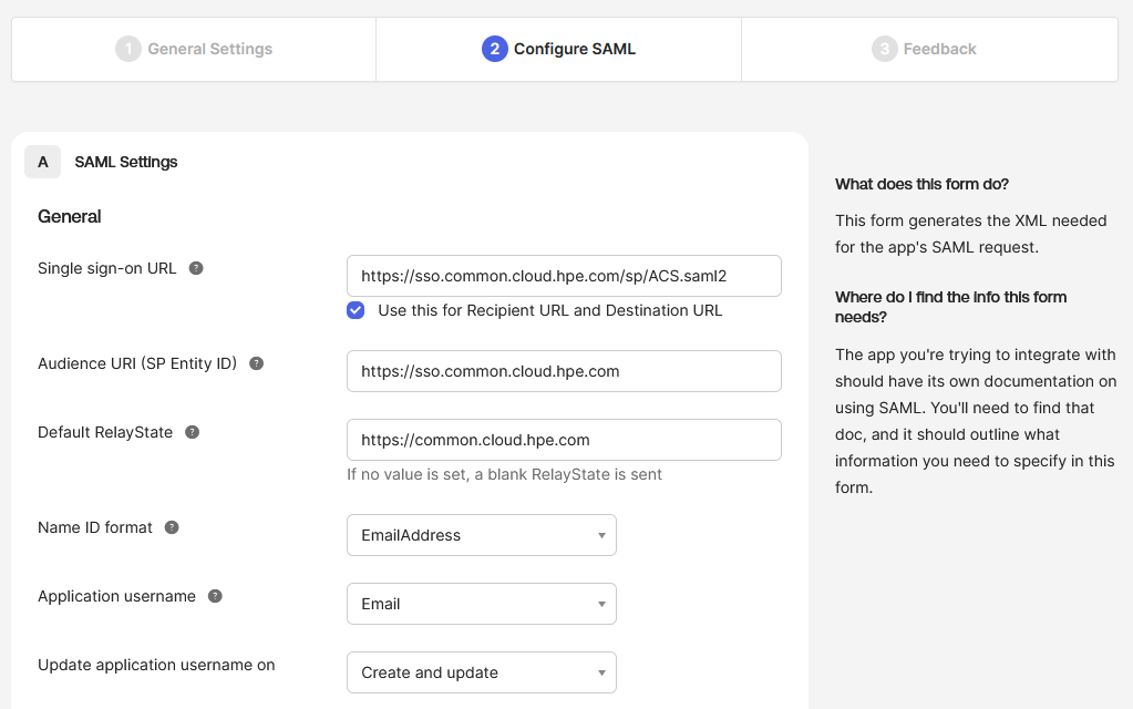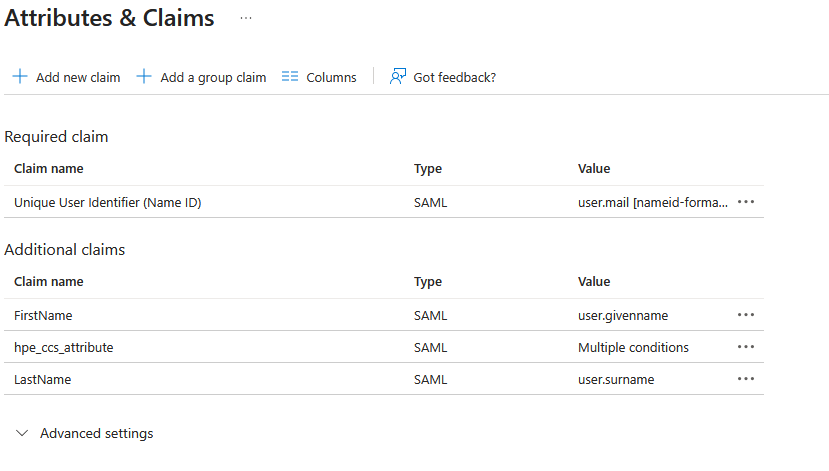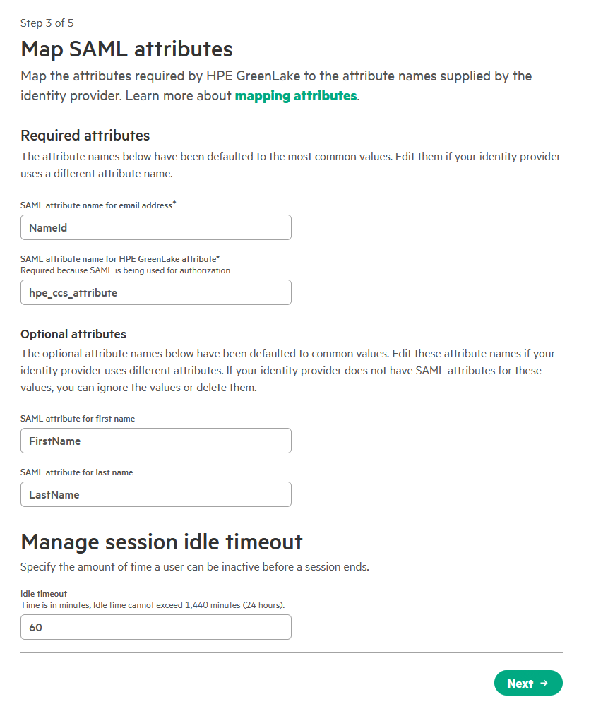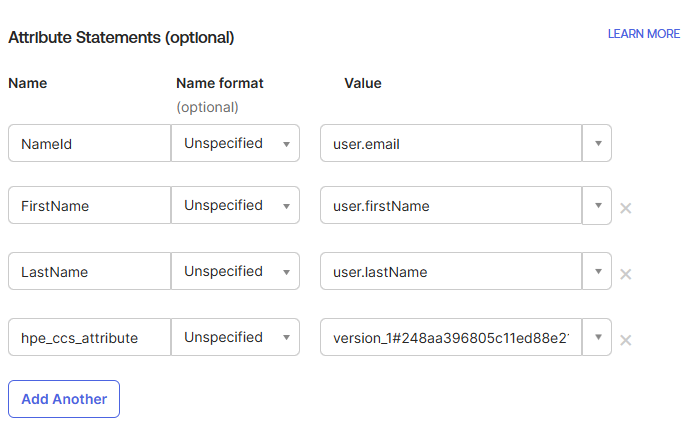 - SAML attribute mapping: Confirm that all required SAML attributes (NameID, FirstName, LastName, and optionally hpe_ccs_attribute) are correctly configured in your identity provider and match the expected format