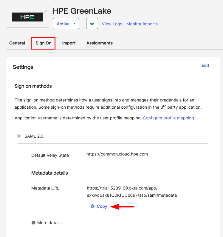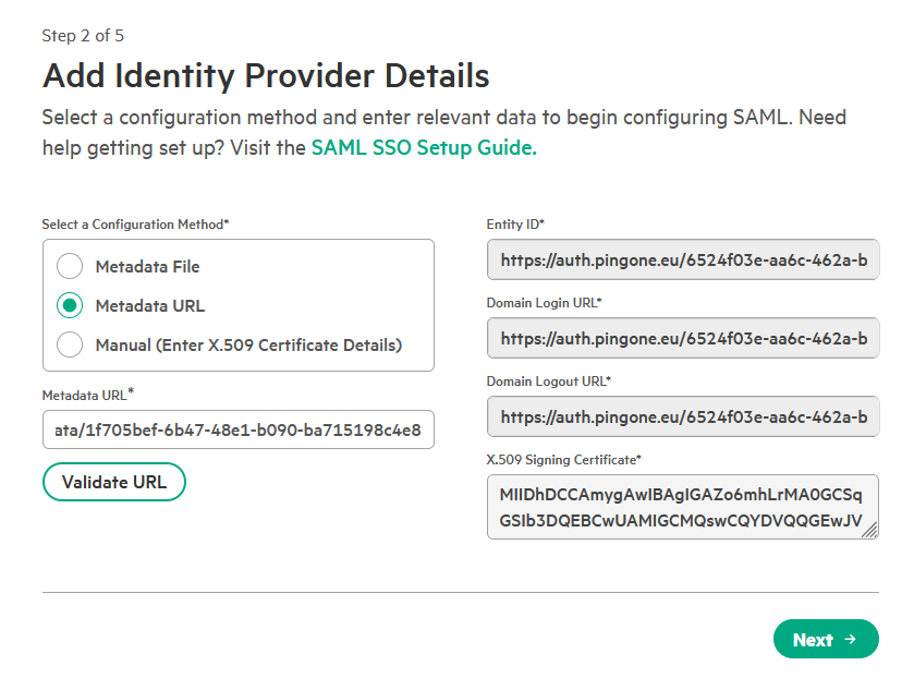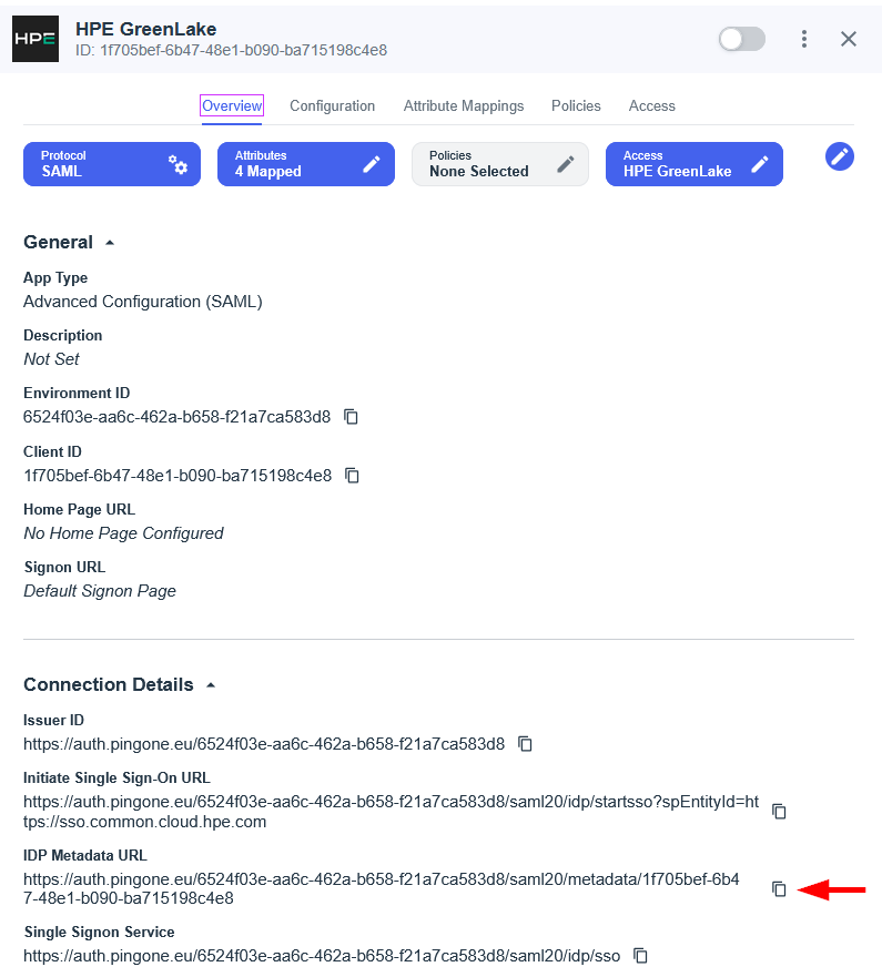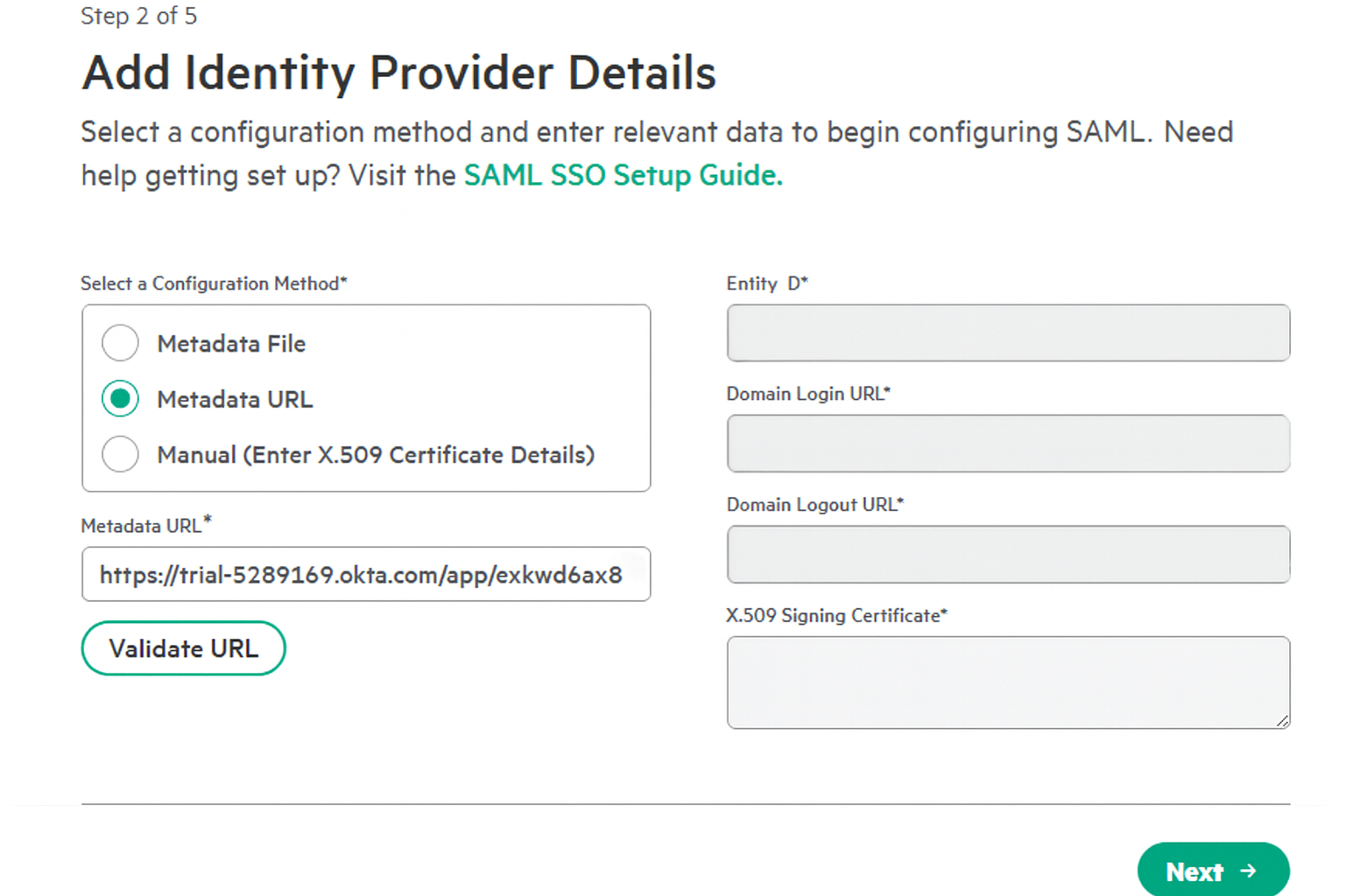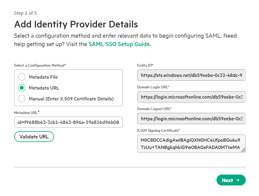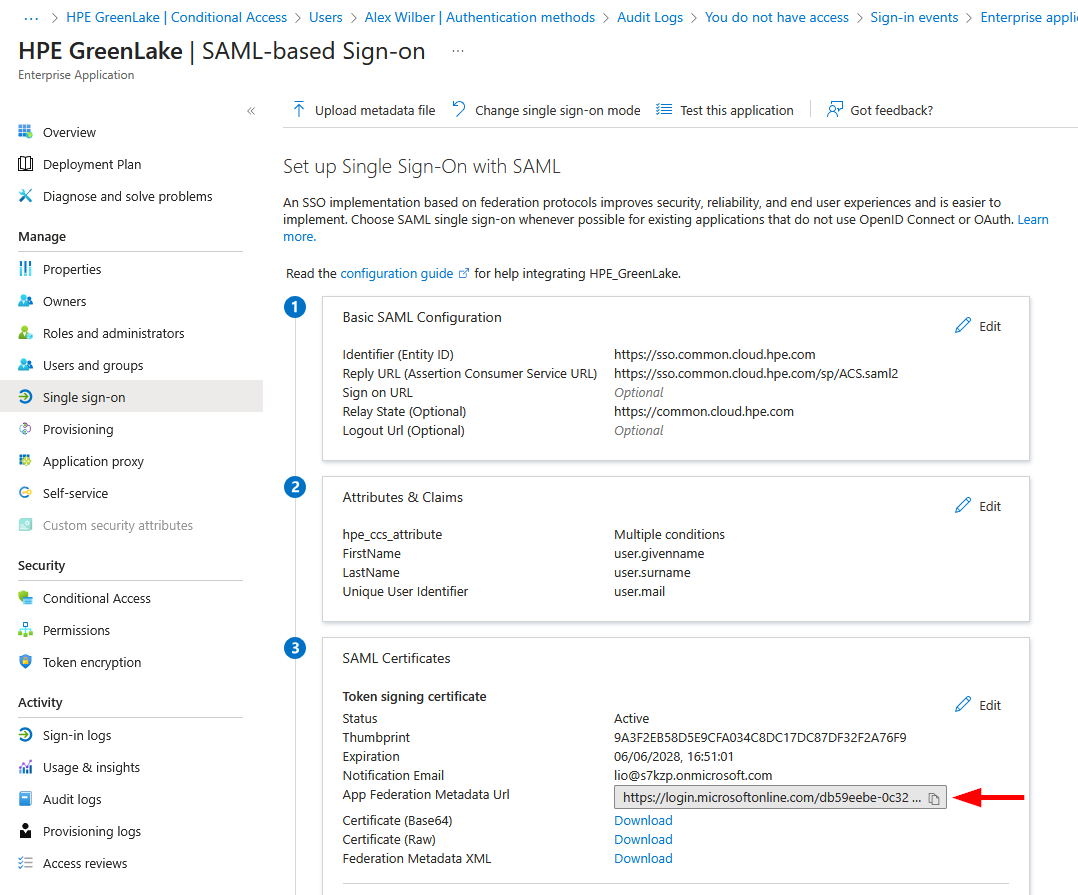 - Review metadata updates: To future-proof your HPE GreenLake SAML setup against certificate rotations, configure the federation metadata URL upfront. Although automatic retrieval isn’t supported yet (as of November 2025—feature under consideration), this enables seamless updates once available, avoiding manual uploads and downtime. HPE GreenLake fetches metadata statically at config time without auto-refreshing certificates currently. If authentication fails post-rotation, verify the URL is reachable and includes the latest