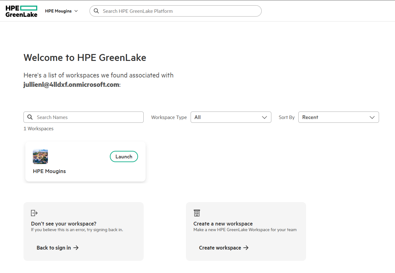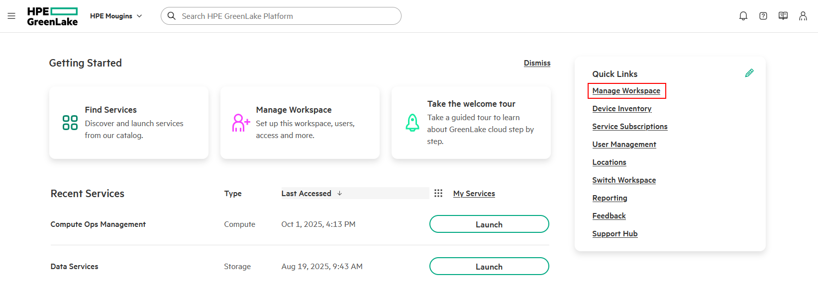 - An active HPE GreenLake workspace with Workspace Administrator access
