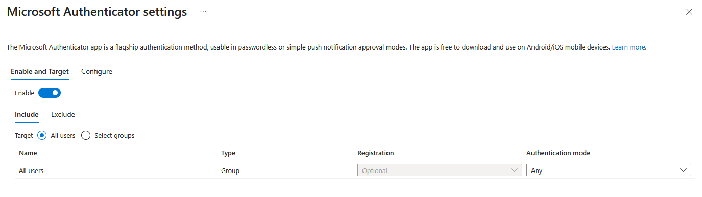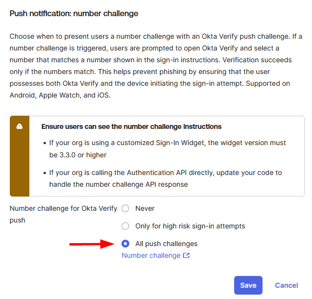 Note: The Number Matching Options setting here should match the number matching configuration you enabled in your MFA policy earlier. Setting it to “Select Number” provides enhanced security by requiring users to select the displayed challenge number from their mobile device.