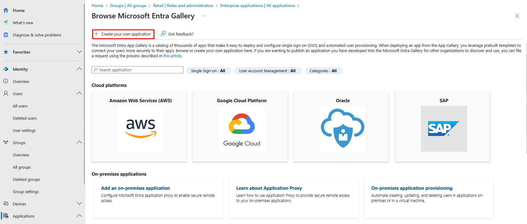 - Enterprise application gallery: Pre-configured and custom SAML application templates