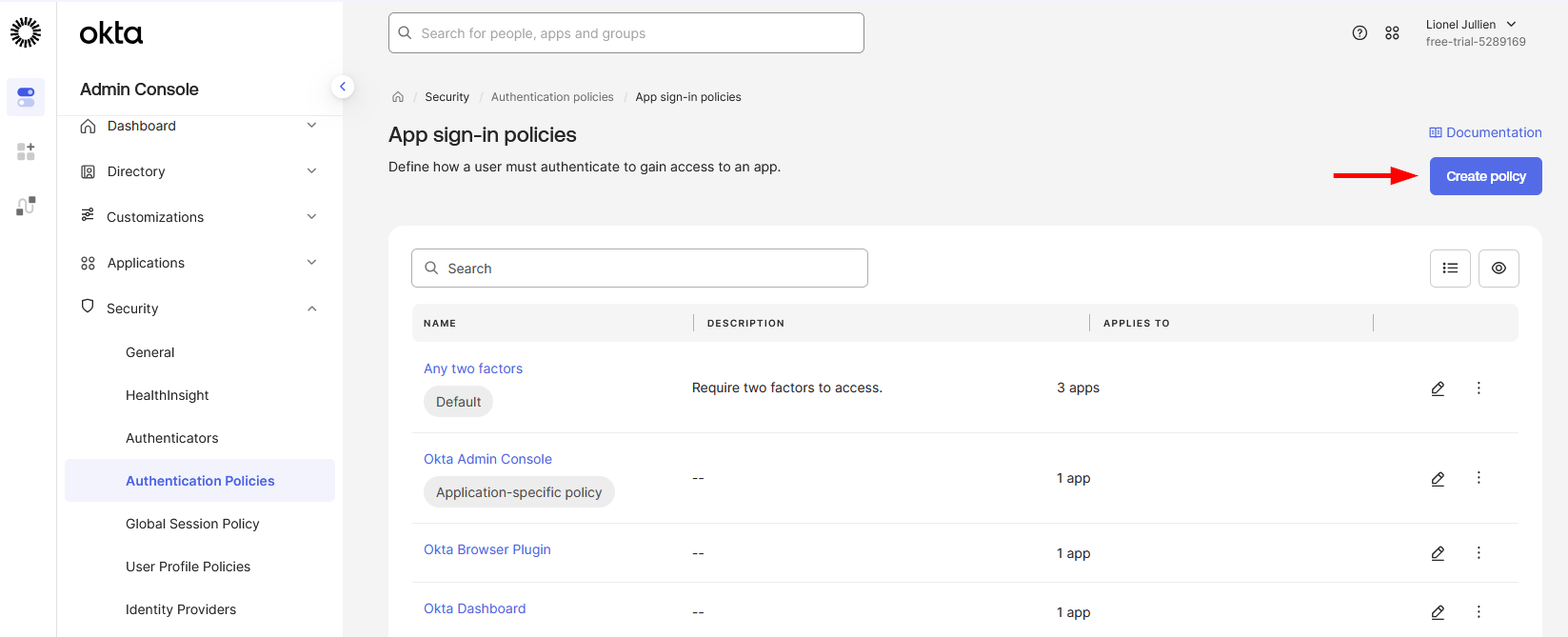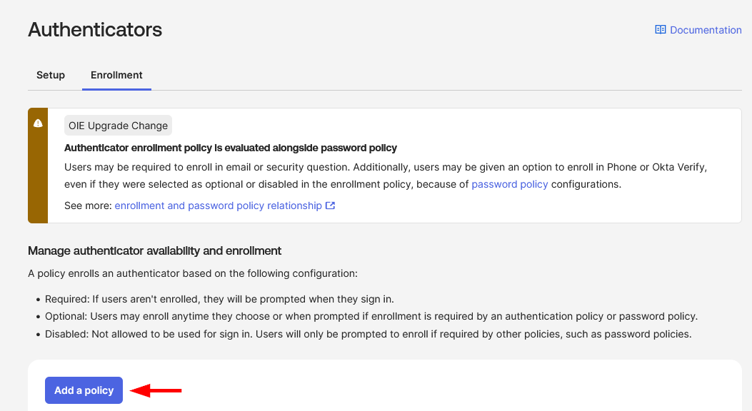 Navigate to Authentication → Authentication → Policies and click Add Policy