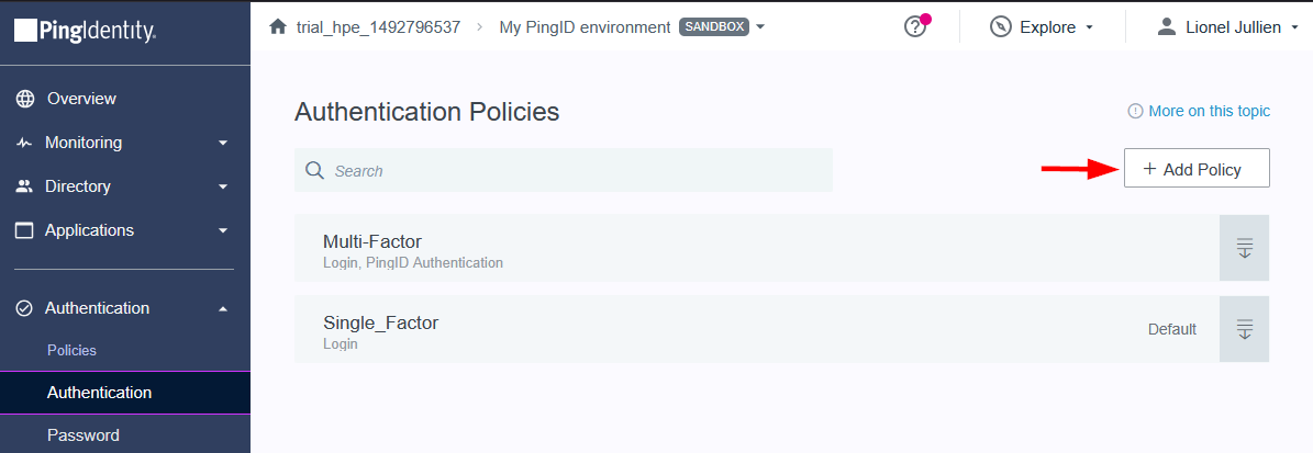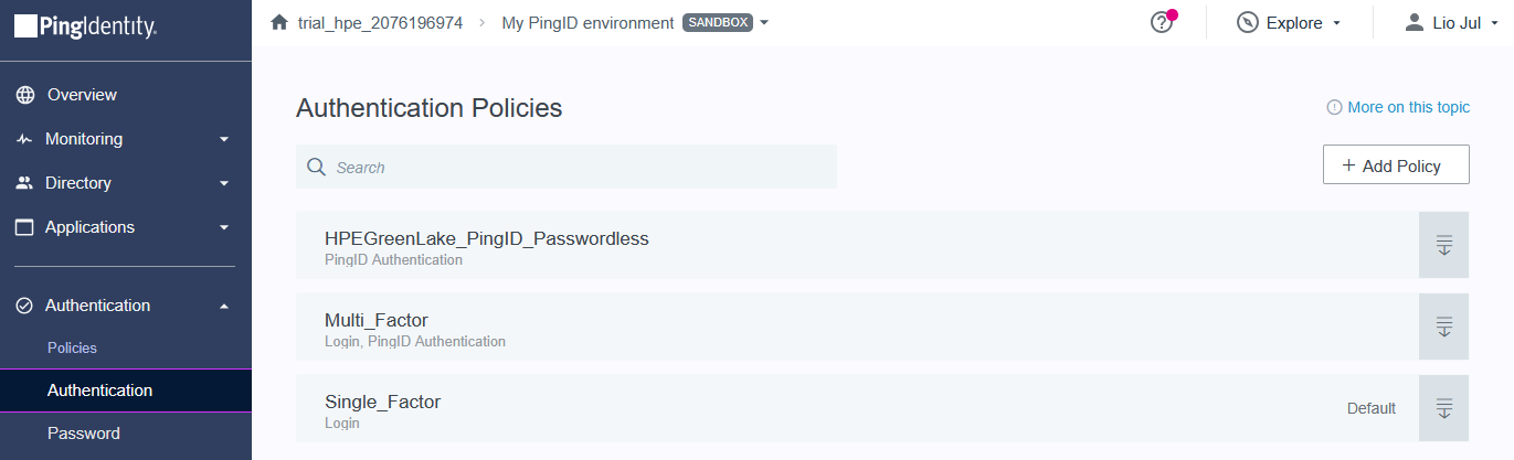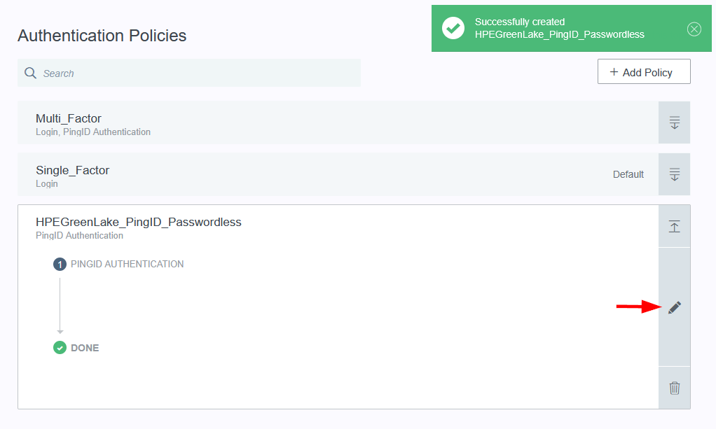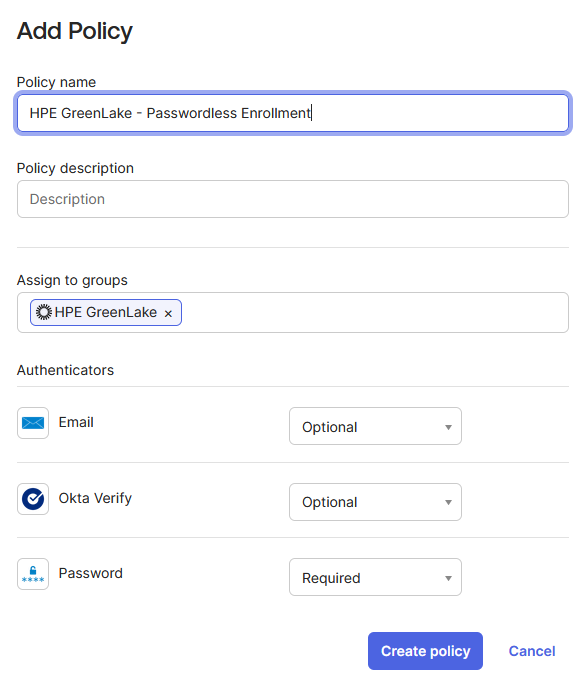 The next step is to create an authentication policy that enforces passwordless authentication for HPE GreenLake users. This policy will require users to authenticate using PingID push notifications or TOTP codes instead of passwords.