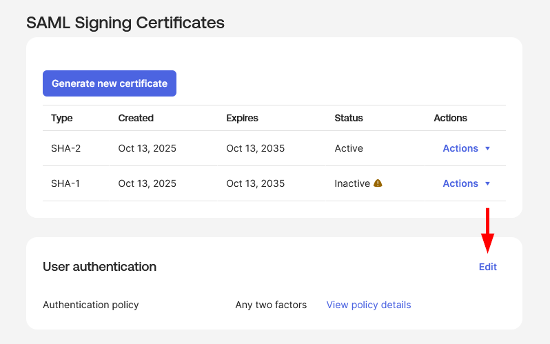- Enable expiration alerts: Configure notifications in your identity provider to receive advance warning (typically 30-60 days) before certificate expiration