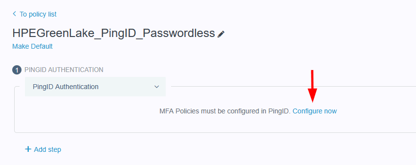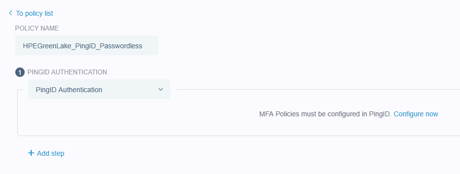 HPEGreenLake_PingID_Passwordless) and select PingID Authentication from the Step Type dropdown -
