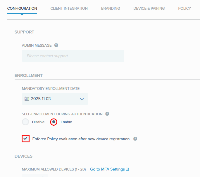 Important: This option ensures that authentication policies are immediately enforced after device pairing, preventing users from bypassing security requirements during the initial enrollment process.