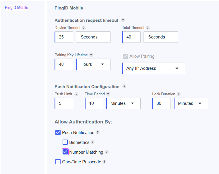 - Number Matching Options: Set to Select Number to enable number challenge during push notification approval (enhanced security)