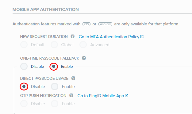 - Select Disable to enforce push notification as the primary authentication method (prevents users from bypassing push notifications by entering OTP codes directly)