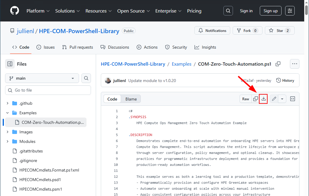 Open Chrome and visit https://github.com/jullienl/HPE-COM-PowerShell-Library/blob/main/Examples/COM-Zero-Touch-Automation.ps1