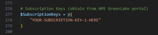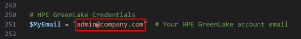 $MyEmail, at line 251, substitute the value with your HPE account email you used earlier to connect to HPE GreenLake: