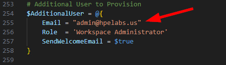 $AdditionalUser, at line 255, enter admin@hpelabs.us as shown below, replacing the existing value: