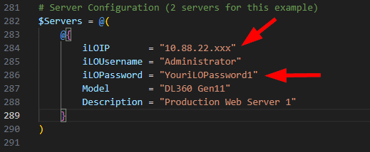 $Servers, at lines 282+, substitute the value with your server’s details (iLO IP and iLO password) found in the login sheet and remove the second server entry like below: