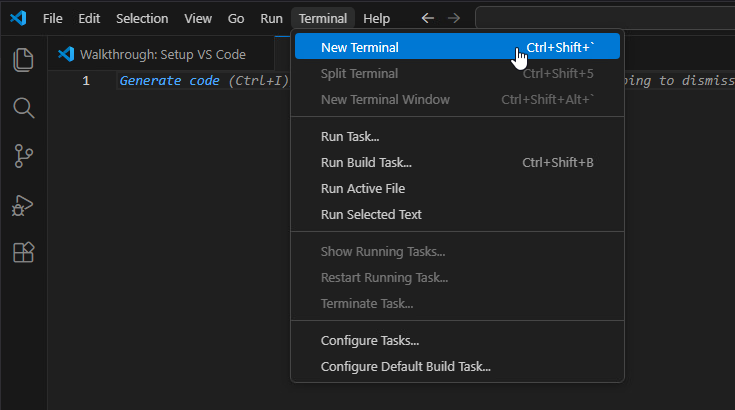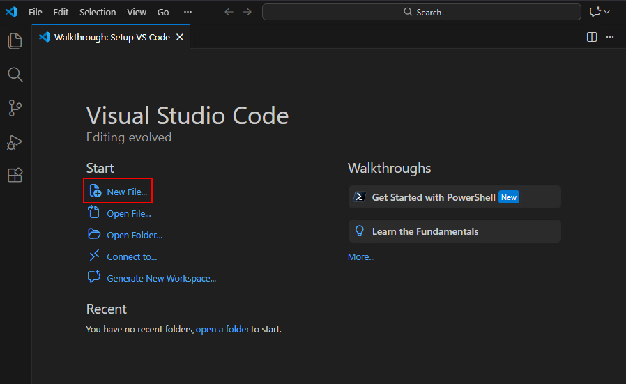Then open a PowerShell terminal using the Terminal menu / New Terminal: