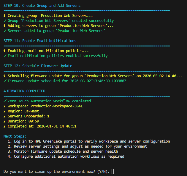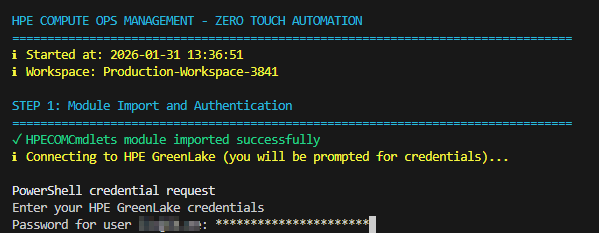 🚀 Looking to demonstrate the power of scripting with HPE GreenLake and Compute Ops Management, see HPE Compute Ops Management Zero Touch Automation Example. This script automates the entire lifecycle from workspace provisioning through server configuration, policy management, and optional cleanup. It showcases best practices for programmatic infrastructure deployment and provides a foundation for building production-ready automation workflows.