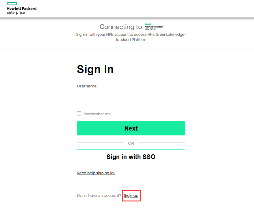 To create your HPE account for this library, go the HPE GreenLake interface at https://common.cloud.hpe.com and click on Sign up: