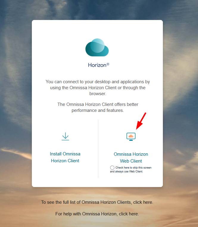 On the Horizon login screen, click the Omnissa Horizon Web Client button.