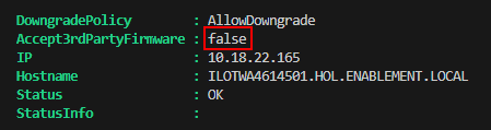 Once the job is completed, query the iLO again to verify that AcceptThirdPartyFirmwareUpdates has been changed back to Enabled on your iLO:
