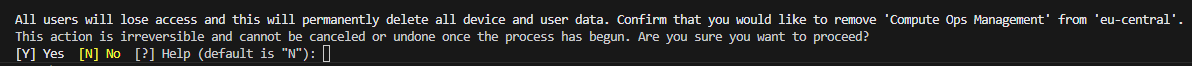Get-HPEGLService -ShowProvisioned | Remove-HPEGLServiceThis action is permanent and cannot be undone. When you execute this cmdlet, you will receive a warning at runtime explaining the irreversible nature of the operation. The system will prompt you to confirm your choice.